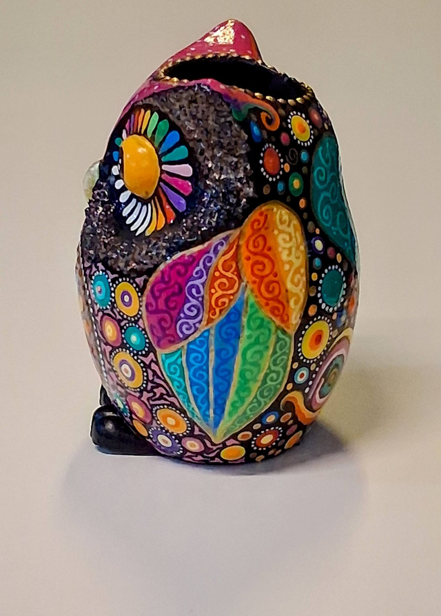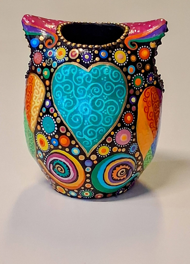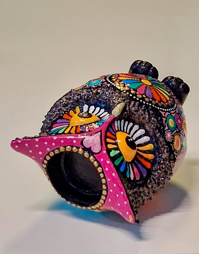 Beeindruckender Uhu, Handarbeit, Einzelstück, Kerzenhalter im Mandala-Stil bemalt.