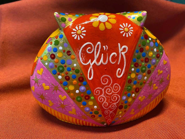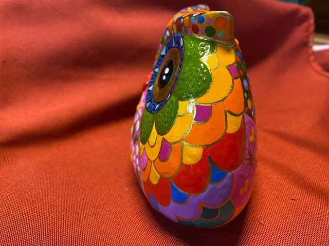 Von Hand bemalte, selbst angefertigte Figur. Motiv Eule im Mandala-Stil.