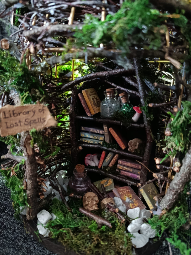 Diese „Library of Lost Spells“ ist komplett handgemacht — aus echten Ästen, Moos, Mini-Büchern und kleinen Geheimnissen.