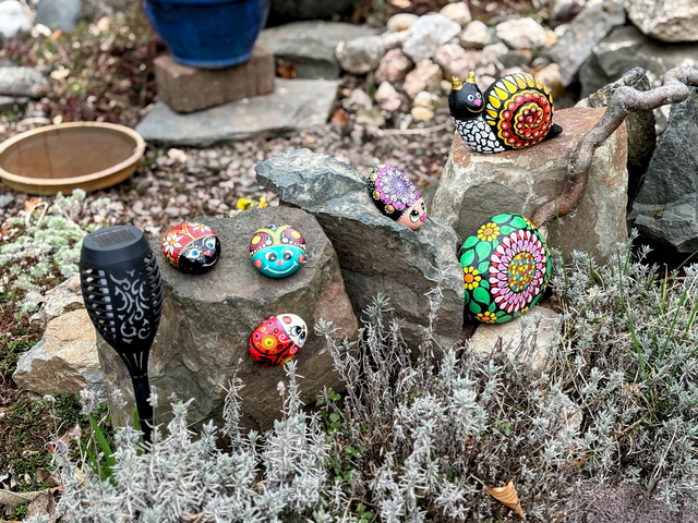 Beispiele zur Dekoration mit unseren Mandala-Figuren im Garten finden Sie auf den beigefügten Bildern.