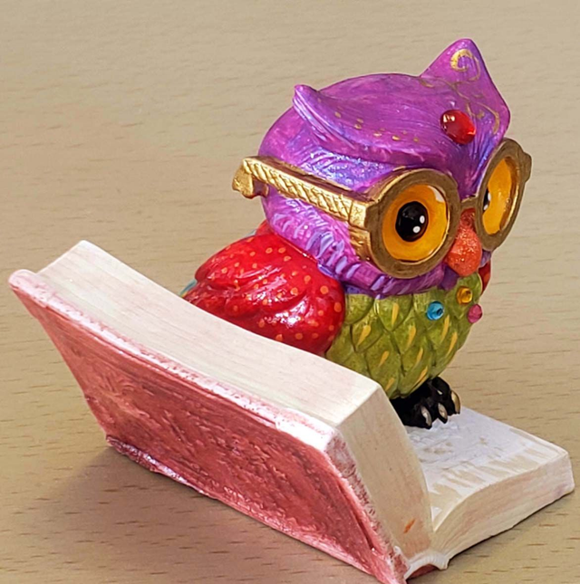 Mini-Eule sitzend auf einem aufgeschlagenen Buch