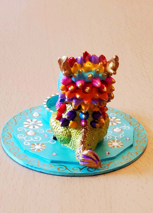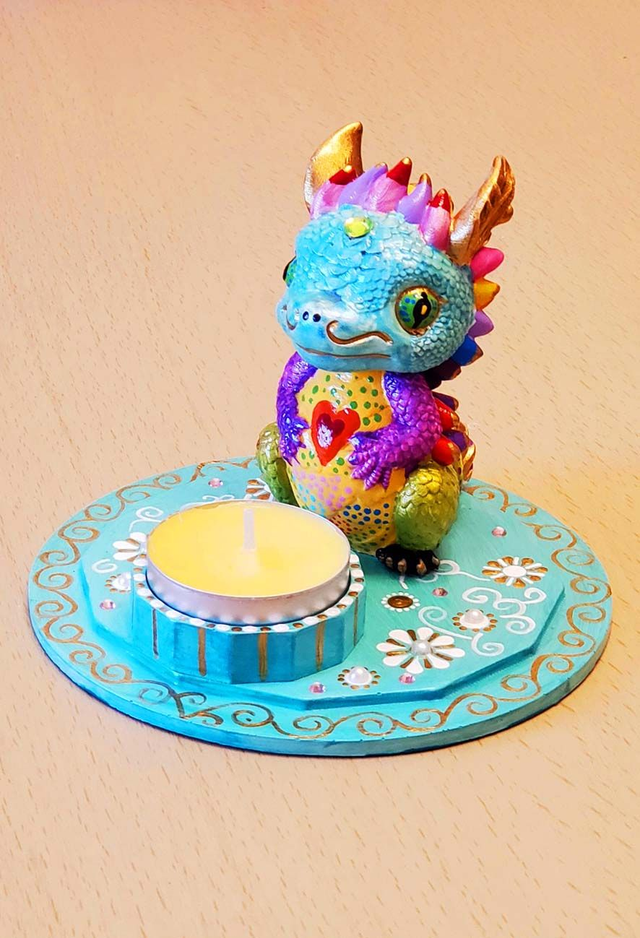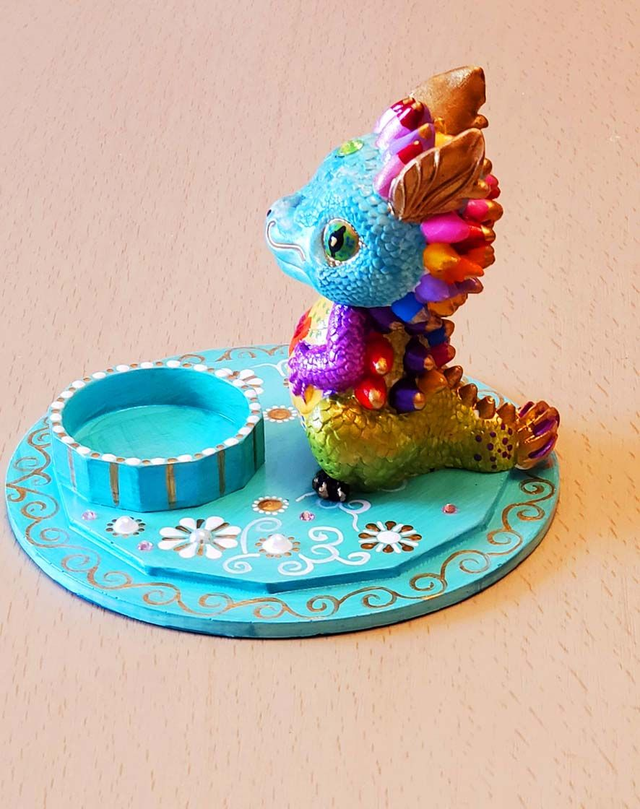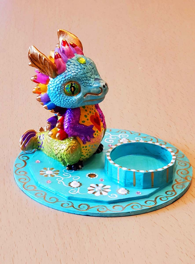 Niedlicher Drache, Dekorationsfigur. Handbemalt im Mandala-Stil. Hergestellt aus Modelliergips und Acrylfarbe. Als Kerzenständer verwendbar.