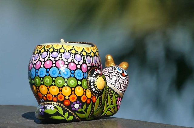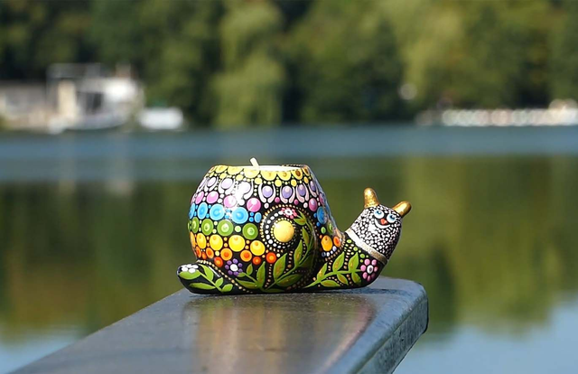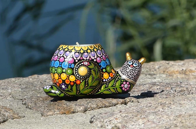 Suchen Sie nach einer einzigartigen und stilvollen Möglichkeit, Ihrem Zuhause einen Hauch von Fantasie und Natur zu verleihen? Dann ist dieser farbenfroher Schnecken-Kerzenhalter im Mandala Stil genau das Richtige für Sie.